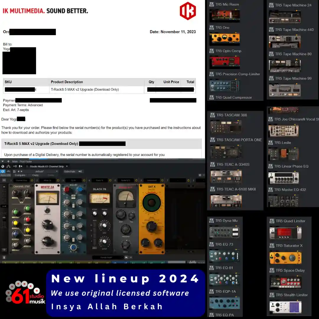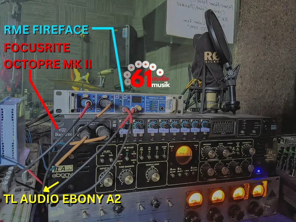 Audio direkam dengan professional hardware recording, multi track : SOUNDCARD RME FIREFACE | AUDIO PROCESSING TL AUDIO EBONY A1, DRUM PREAMP FOCUSRITE OCTOPRE MK2, MIC PREAMP | TRIGGER DRUM, KEYBOARD, RODE MIC, BLUETOOTH QUALCOM 5.0 aptX HD AUDIO, SMARTPHONE MIRRORING TO 32″ TV UNTUK SCREEN TEXT, and still moore..